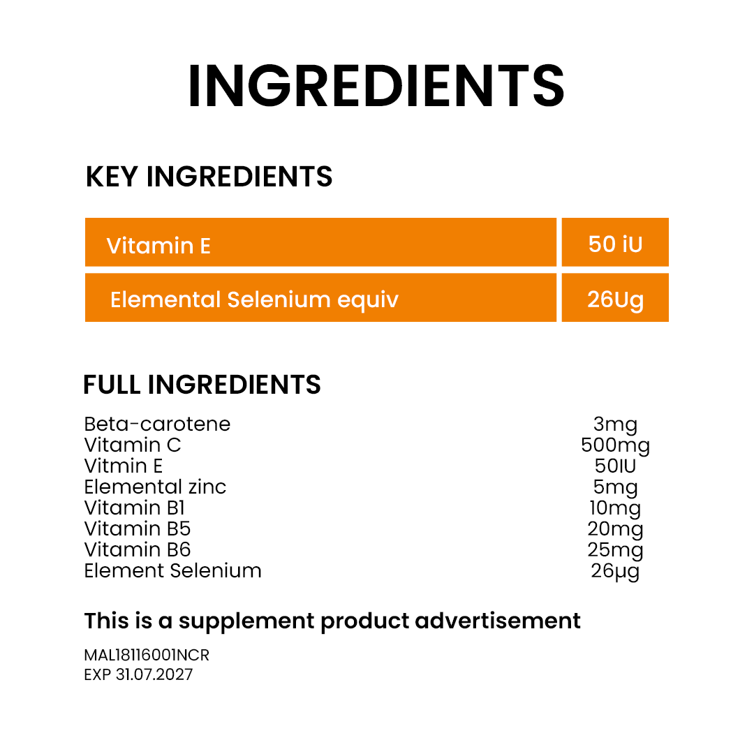 Vitamin E (as d-alpha tocopheryl acid succinate 43.39mg) 50IU.