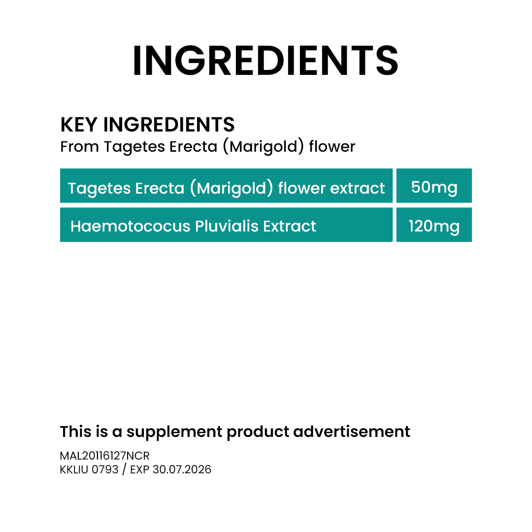 A nutritional supplement for adults that contains antioxidants to maintain their general well-being. Contains a blend of essential nutrients. This includes Astaxanthin (AstaReal®) and Lutein & Zeaxanthin (Lutemax 2020®). Contains 10 mg of Lutein: 2 mg of Zeaxanthin (5: 1 ratio). Lutein and Zeaxanthin are sourced naturally from marigold flower extract.