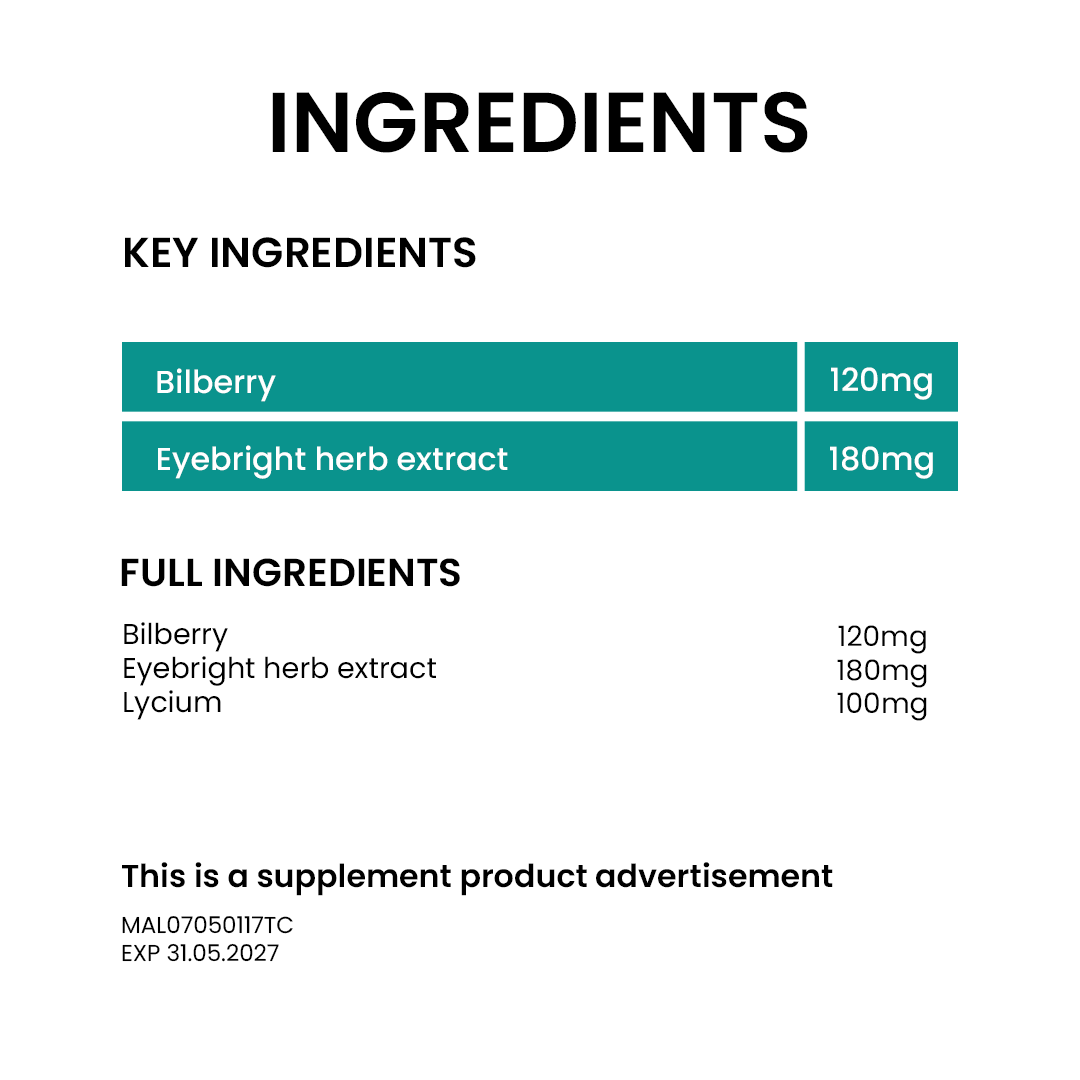 Bilberry & Eyebright Complex is a powerful blend of 3 herbs to support eye health. Rich in antioxidants, it shields your eyes from blue light and UV damage while soothing tired eyes. Bilberry provides anthocyanins, Eyebright offers antioxidant benefits, and Lycium (wolfberry) boosts vision with carotenoids.