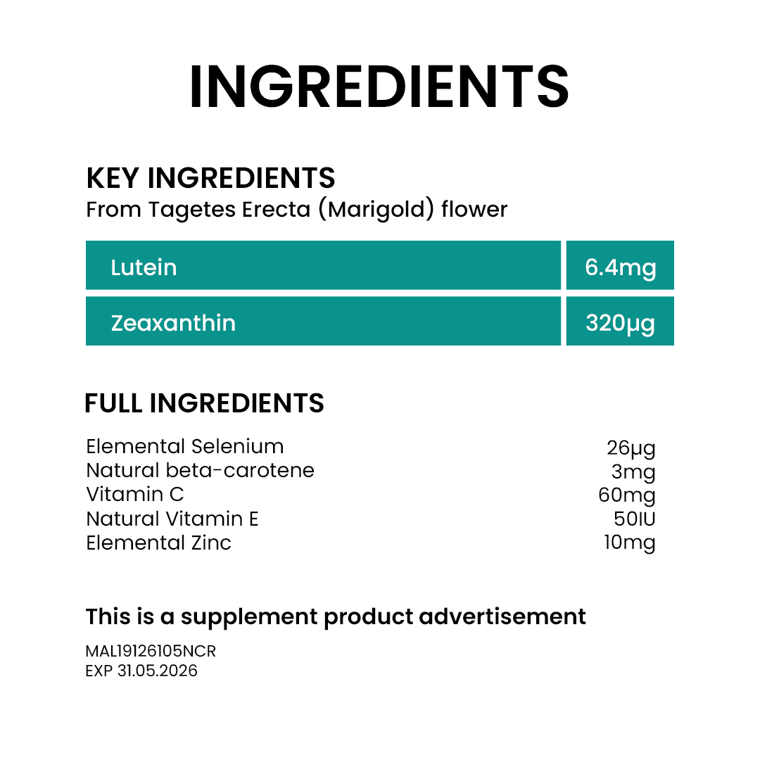 Protect the eyes against harmful blue light and UV rays, reducing the risk of light-induced oxidative damage. It has Lutein and zeaxanthin, essential nutrients found in the macular of the eye.
