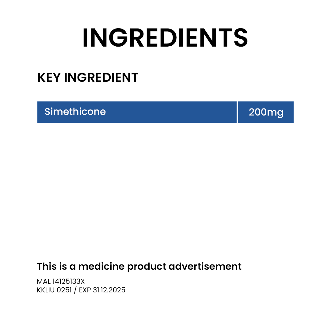 Gazgo is a powerful anti-flatulence remedy containing 200mg of simethicone. It helps eliminate intestinal gas and prevents its buildup by breaking down gas bubbles. Ideal for those suffering from indigestion, GERD, or diarrhea, simethicone is not absorbed by the body and is safely eliminated, providing effective relief from gas symptoms.