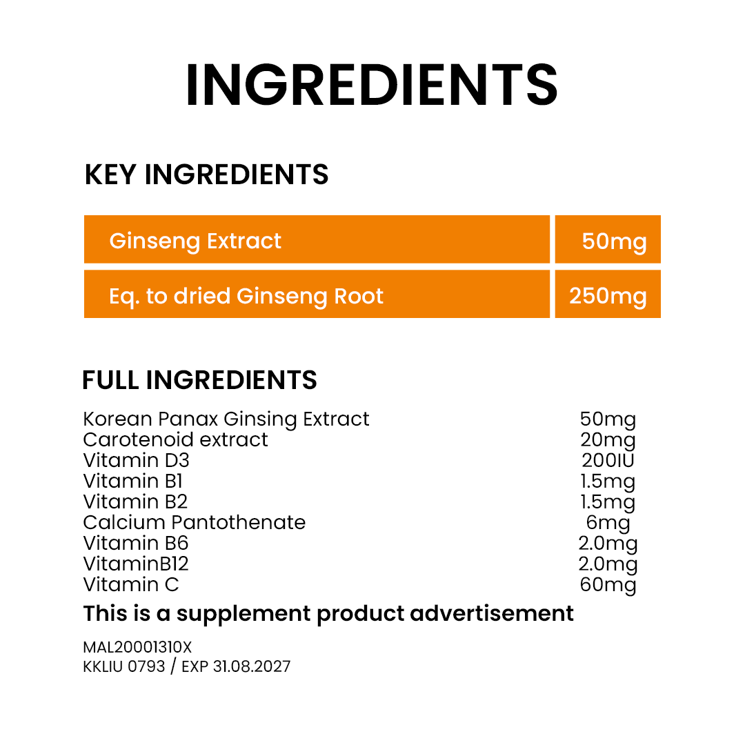Ginsomin contains 50mg of standardized old Korean Panax ginseng extract, fortified with 11 vitamins and 9 minerals.