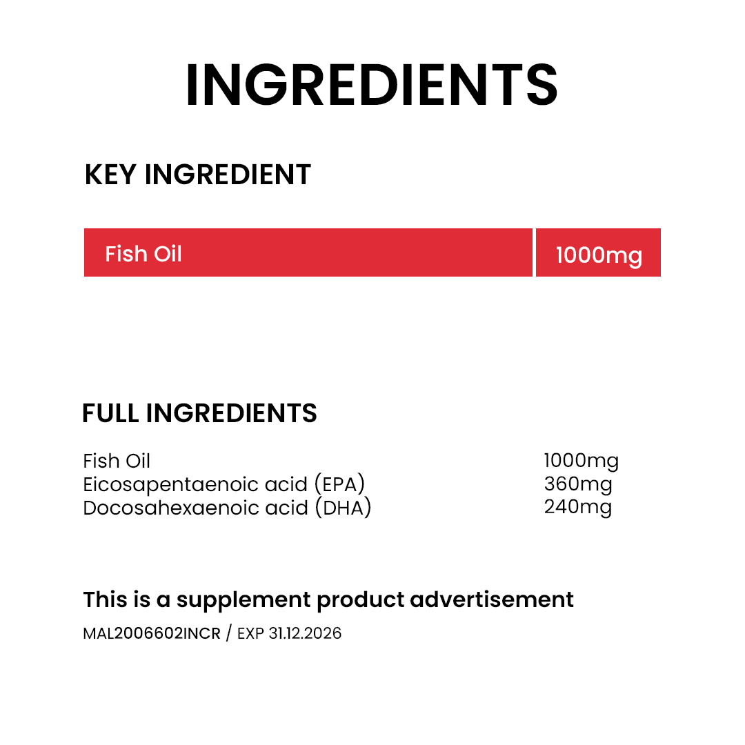 MaxX Fish Oil is a high strength quality fish oil that providing 65% of omega-3 fatty acids (360mg EPA, 240mg DHA and 100mg of free fatty acids). The omega-3 fatty acids are extracted from deep sea small fish (anchovies).