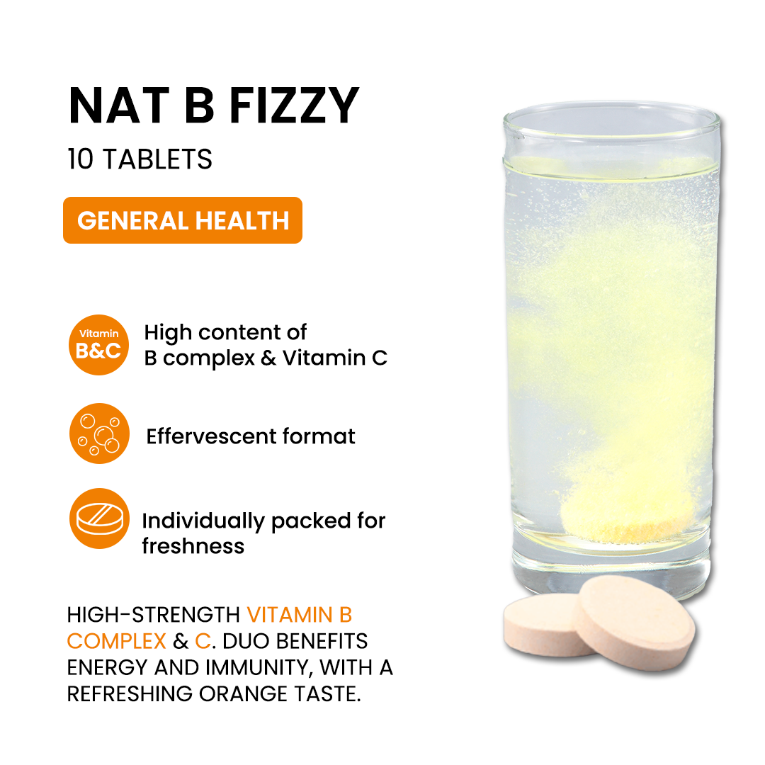 Nat B Fizzy replenishes your daily needs of vitamin B complex for energy and vitality. Added with magnesium and calcium to help relieve general tiredness and weakness due to hectic lifestyle and Vitamin C 1,000mg to support immune health.