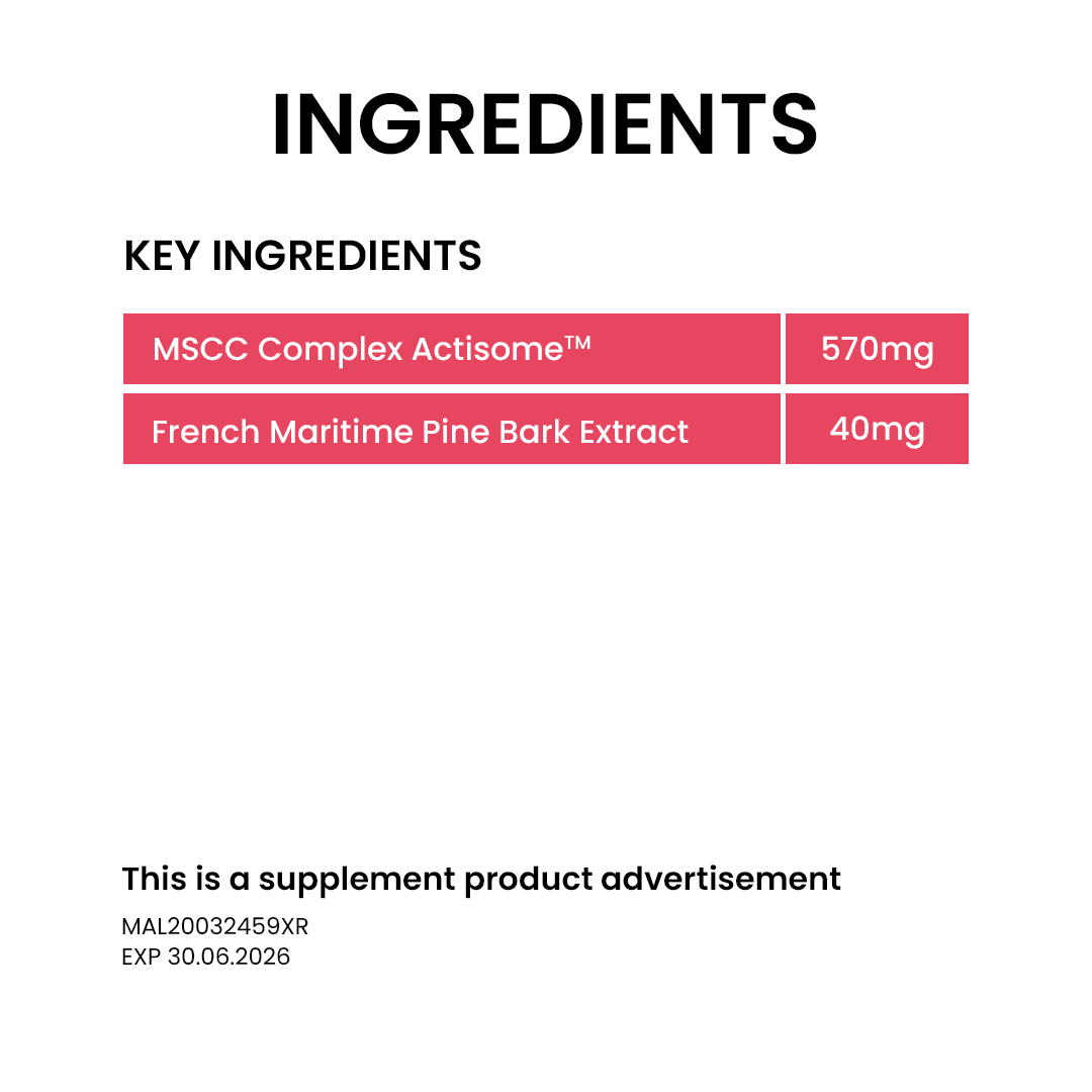 Pynocare is a health supplement featuring the patented MSCC Complex Actisome™, which enhances absorption of its natural ingredients. Each dose includes 40mg French Maritime Pine Bark, 60mg Vitamin C, 20mg D. Salina Extract, 6mg Mixed Carotenoids, and 15IU Natural Vitamin E—all aimed at promoting overall health.