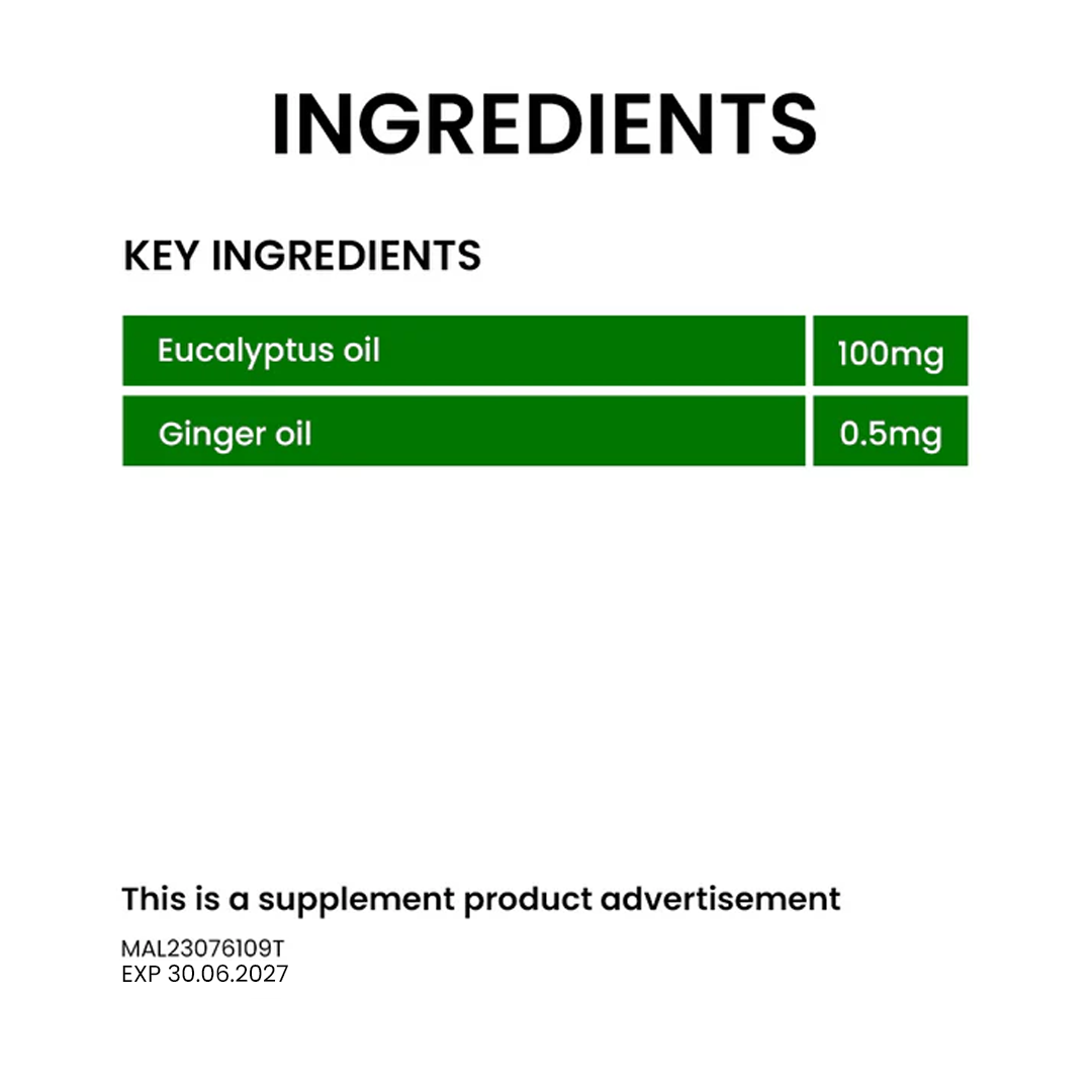 Eugica Coff Cough Relief Capsules are formulated with natural extracts, such as Eucalyptus and Ginger oil, which are traditionally used to relieve cough. These capsules provide convenient relief from cough symptoms and are easy to use anytime, anywhere.