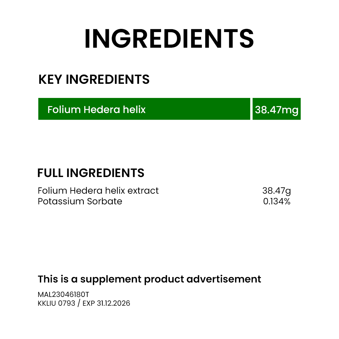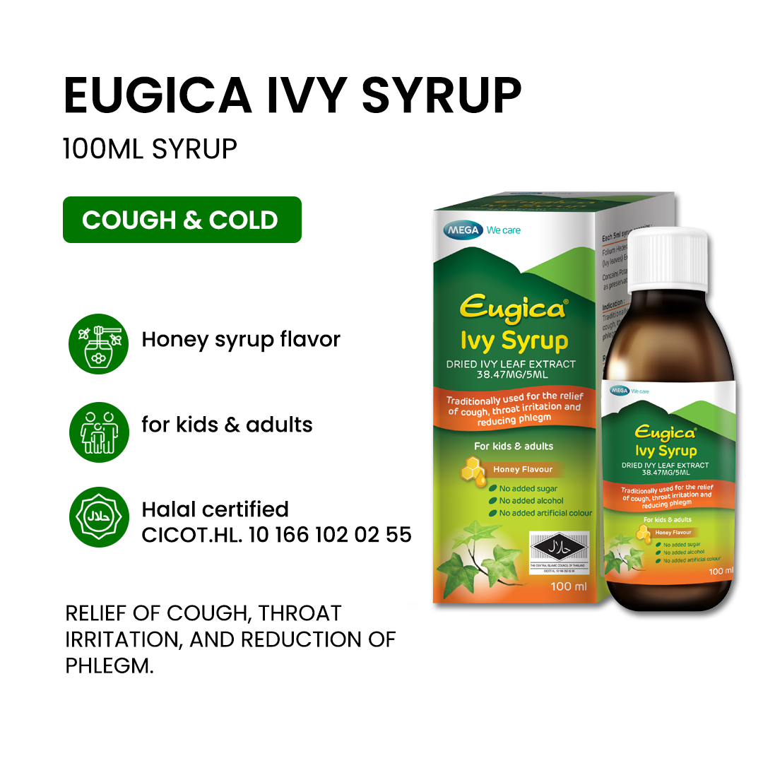 Eugica Ivy Syrup is a halal-certified herbal remedy made from dried Ivy leaves (38.47mg per 5ml). It relieves cough, throat irritation, and phlegm. With a delicious honey flavor, it's suitable for adults and children. This syrup contains no added sugar, alcohol, or artificial colors, ensuring a soothing experience.