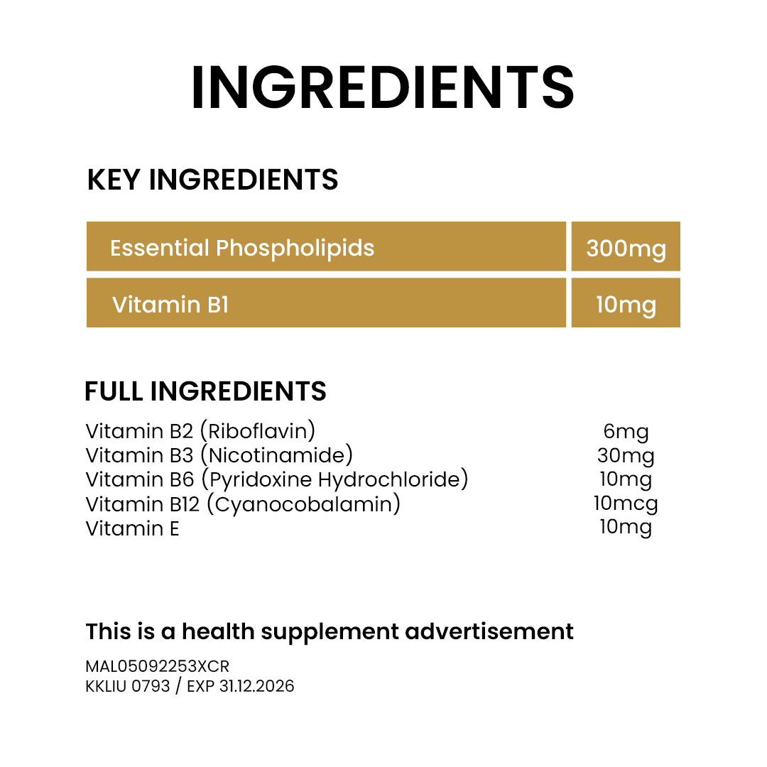 Essential Phospholipids helps in maintaining health. Vitamin B (Energy) helps boost energy production which improves cellular metabolism and Vitamin E (Protect) is an antioxidant that protects the cells from free radical attack.